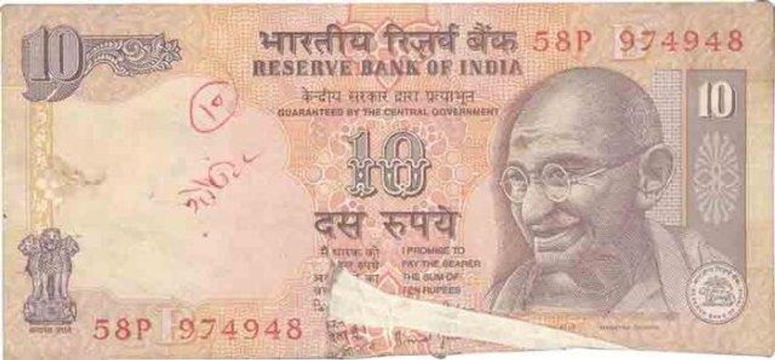 Error Ten Rupees Bank Note of Republic India.
