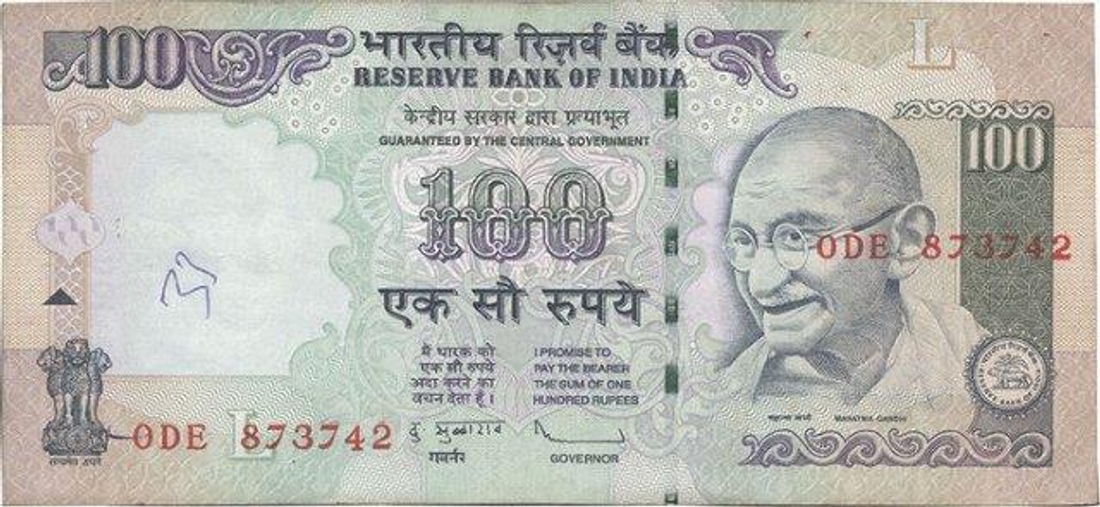 Error One Hundred Rupee Bank Note of Republic India.