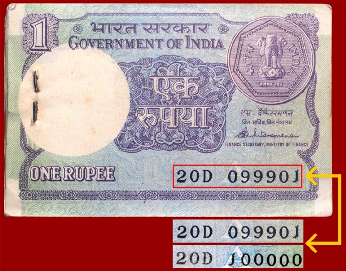Error Bundle of One Rupee Bank Notes Signed By I.G.Patel.