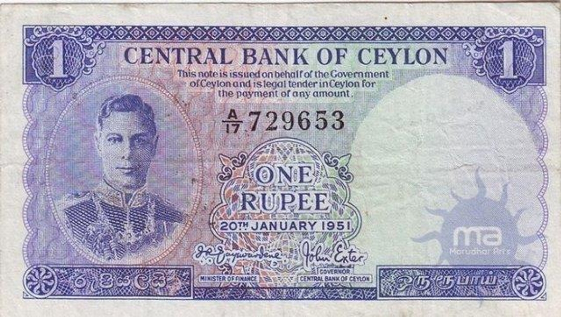 One Rupee Paper Money of Ceylon of 1951 issued.