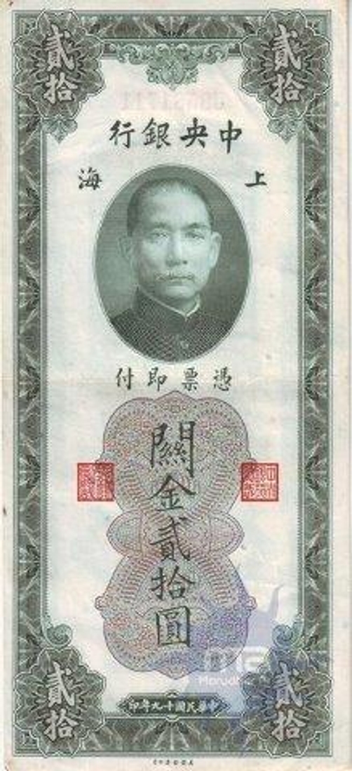 Paper Money of China of 20 Gold Units of 1930 issued.