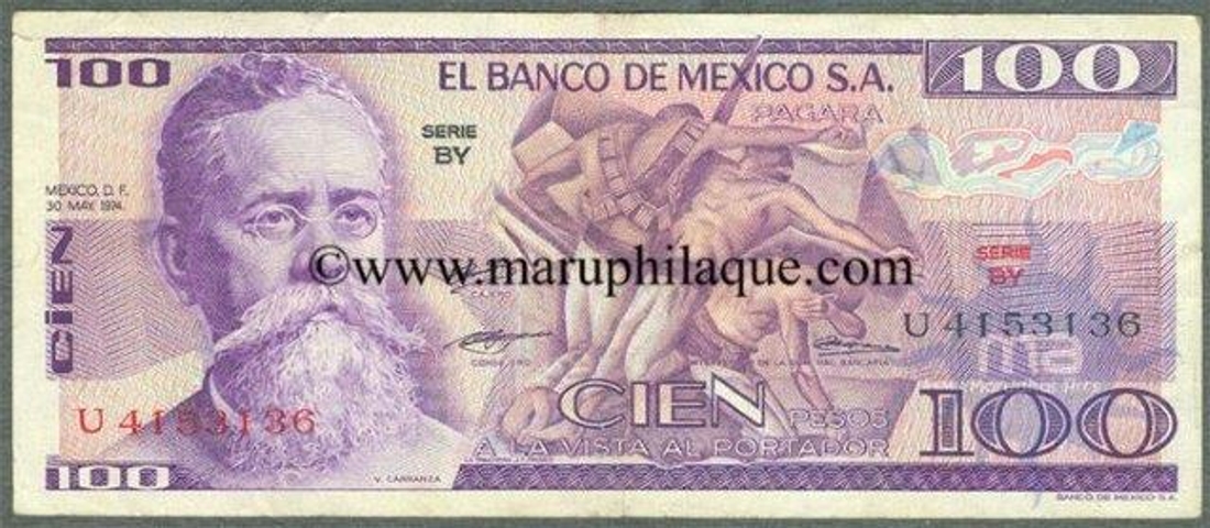 Paper Money of Mexico of 100 Pesos of 1974 issued.