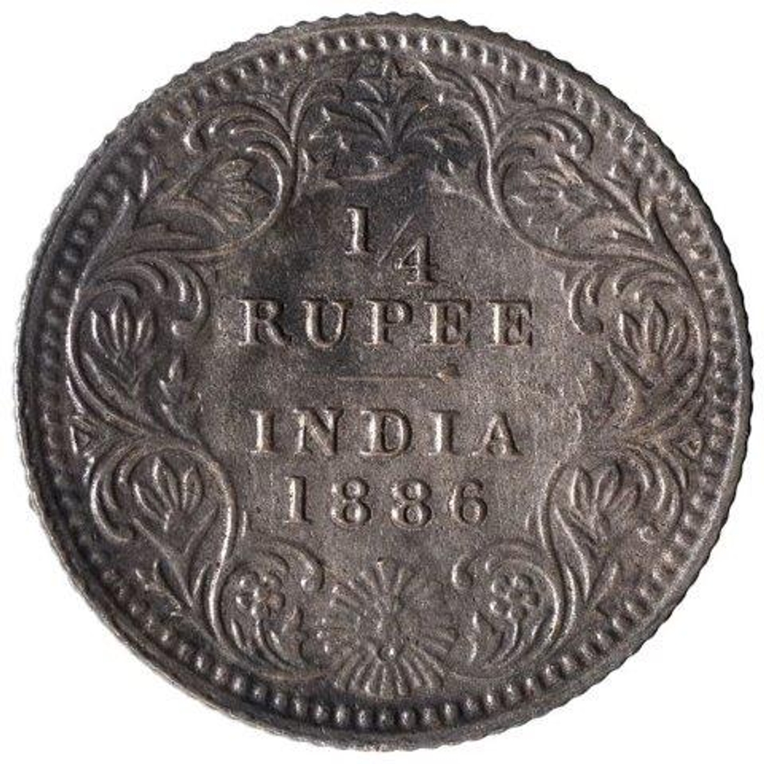 Silver Quarter Rupee Coin of Victoria Empress of Calcutta Mint of 1886.