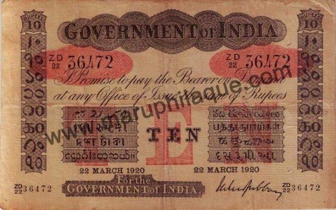 Uniface Note. KGV 10Rs. 1920 March 22. M.M.S.Gubbay. ZD22 36472. VF+. Scarce.