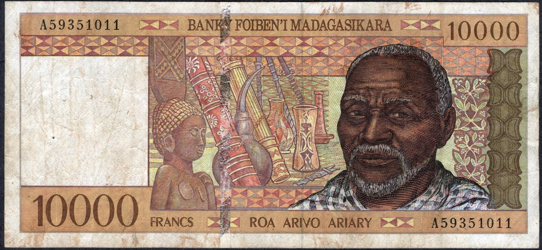 Ten Thousand Francs Note of 1995-2003 of Madagascar.