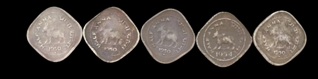Lot of Five Copper Nickel Half Anna Coins of Republic India.
