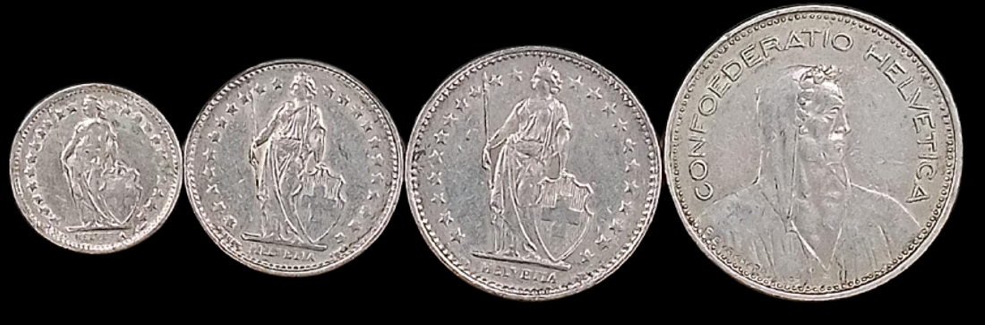 Set of Four Different Cupro-Nickel Franc Coins of Different Year of Switzerland.