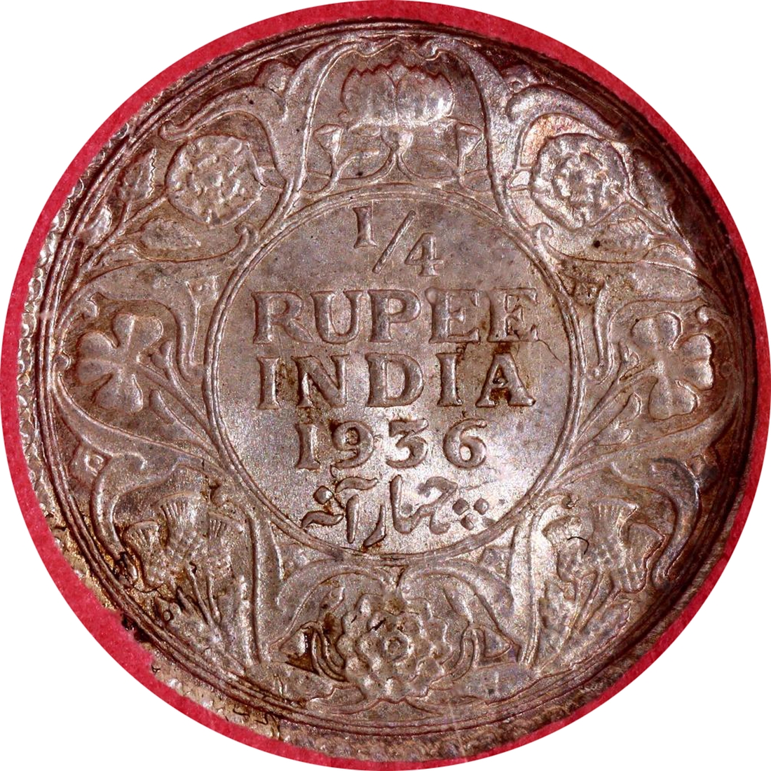 NGS MS 61+ Graded Silver Quarter Rupee Coin of King George V of Calcutta Mint of 1936.