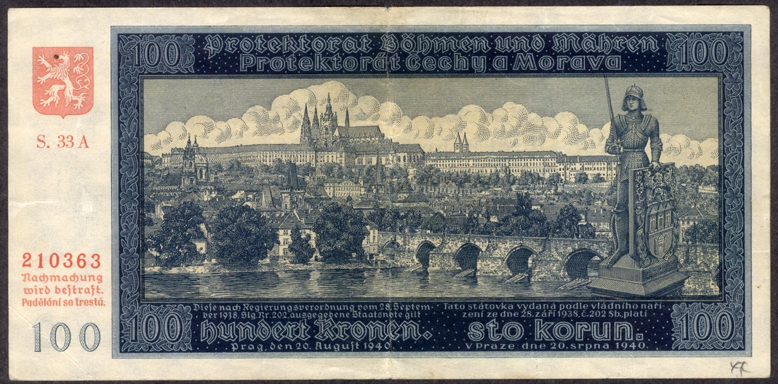 1940 One Hundred Korun Bank Note of Bohemia and Moravia.