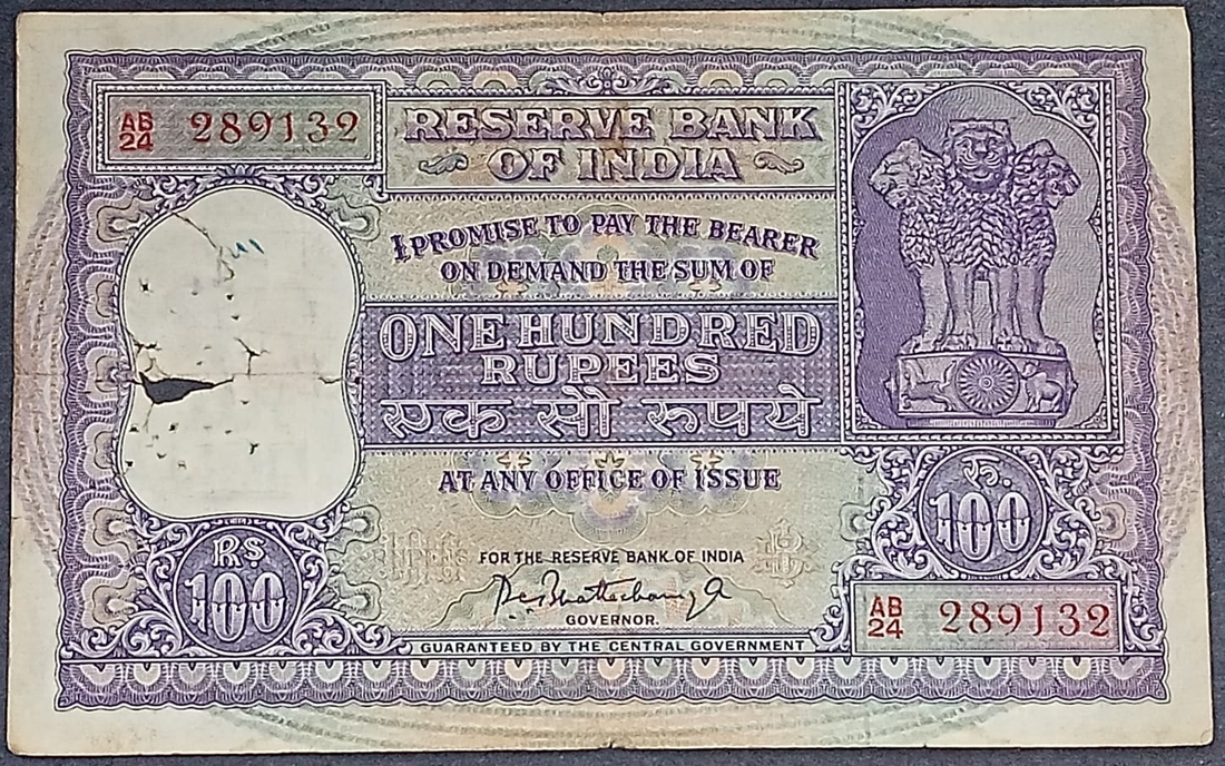 1960 One Hundred Rupees Bank Note of P.C. Bhattacharya.