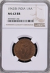 NGC MS 62 RB graded Bronze One Quarter Anna Coin of King George VI of Bombay Mint of 1942.