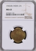 NGC MS 63 graded Nickel Brass Two Annas Coin of King George VI of Bombay Mint of 1943.