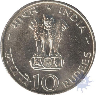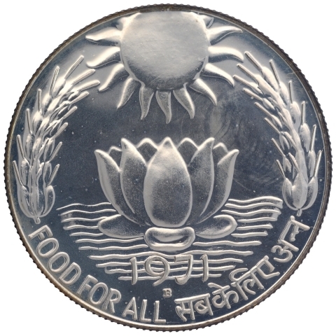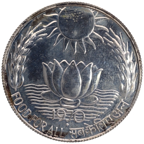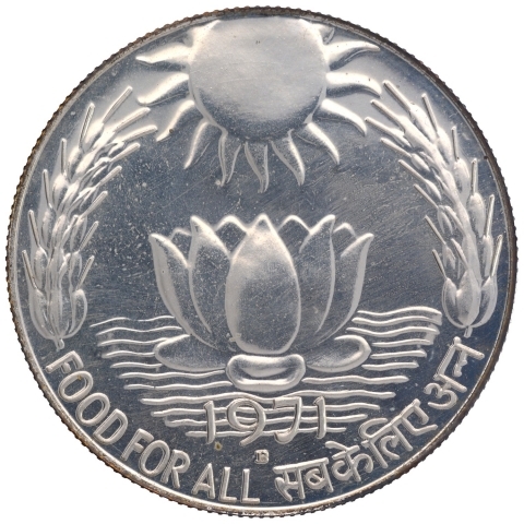 Ten Rupees Coin of Food For All Sun and Lotus of 1971.
