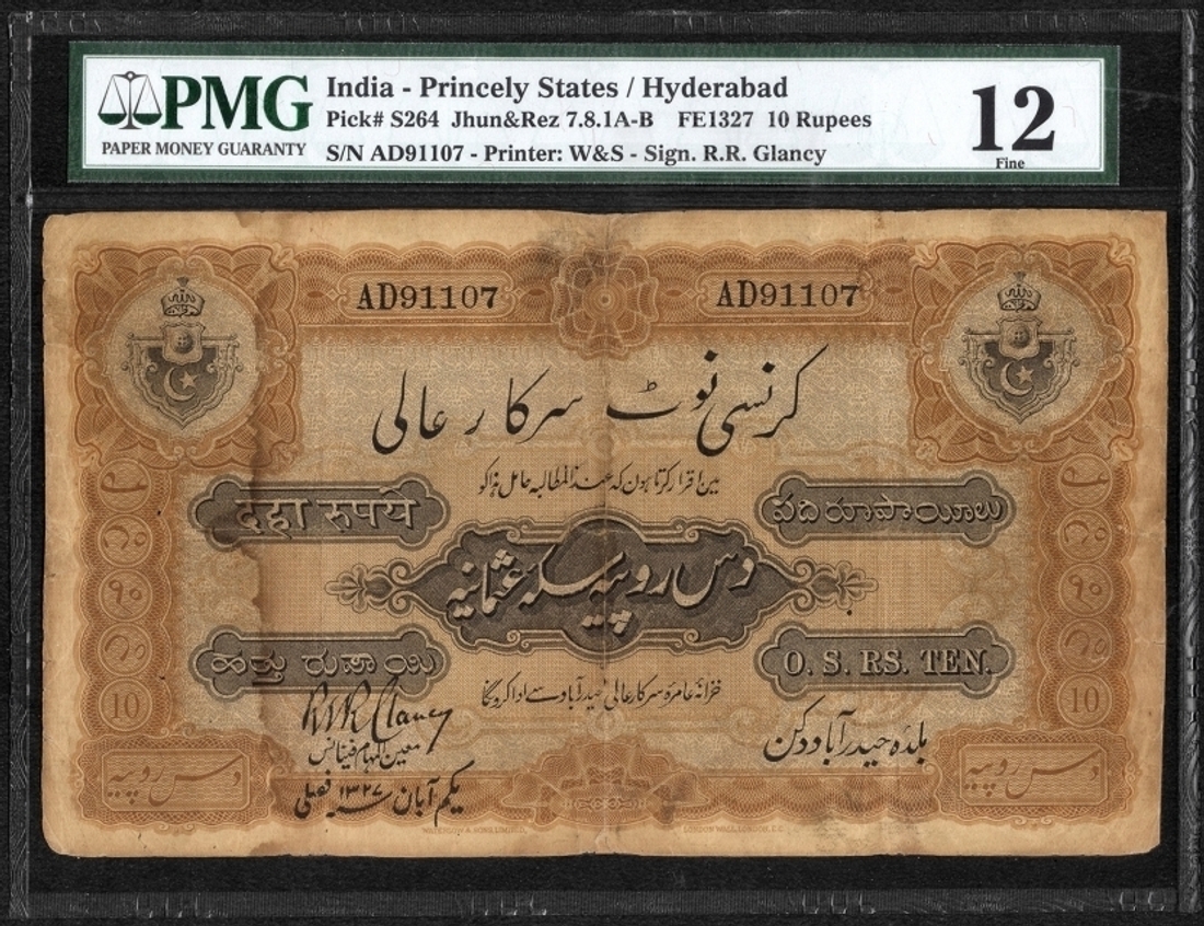Rare Hyderabad State Ten Rupees Note signed by Ghulam M ...
