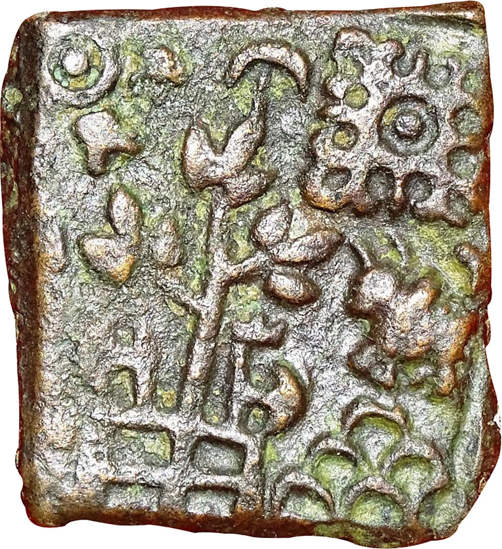 Copper Square Coin of Sangam Pandyas with Bull, Fish, H ...